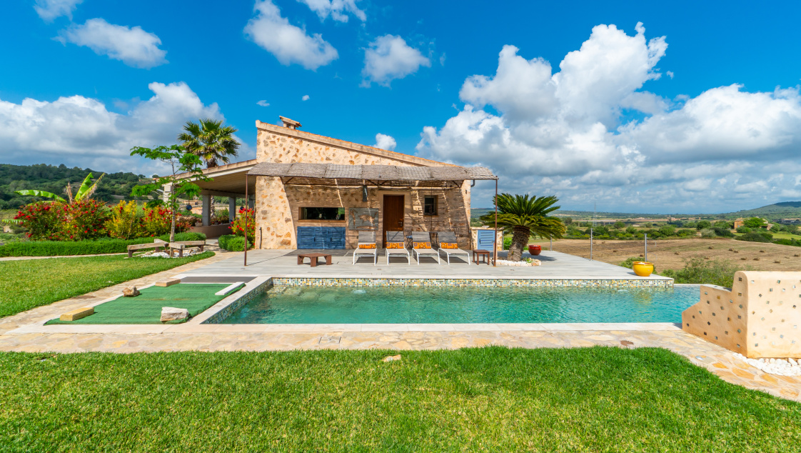 La elegante finca "Desigual" está situada en una colina en el este de Mallorca y ofrece vistas espectaculares y total privacidad. Cuenta con 4 dormitorios decorados individualmente, 3 baños, un baño de invitados, cocina abierta y salón luminoso. El exterior incluye una piscina con contracorriente, terrazas, jardín con cítricos y una cocina de verano con zona lounge. Manacor está a solo 6 km; las playas como Cala Romantica se encuentran a 20–25 km. Un refugio perfecto para familias o grupos.